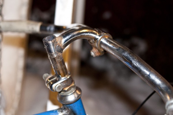 This is the story of my chop shop bike. I got this old Tunturi VIP from a cycling buddy in Oulu. It is way too big for me and made from solid non-butted steel tubes. Perfect for chopping. After disassembling the bike I first chopped off the rear triangle. I drilled a hole through a 120mm wide block of wood and drove a long 10mm bolt through to keep my new tracks drops in place. Then I fastened that block of wood to a solid welding table and positioned the rest of the frame accordingly and welded the rear triangle parts back on. For welding the tubing I cut small blocks of wood of different heights, two blocks for each tube diameter, top tube, head tube etc. When I position the tubes on the blocks on a flat surface all the tubes will be at correct height in relation to each other eg. the center lines of all the tubes are at same level. After that it is easy to weld everything back together. I did not do much mitering, just roughly checked that everything goes together. Mig welding will allow you to fill in small gaps easily, which might not be good for strength, but who cares, it is not a BMX bike. This will be a quasi scientific experiment on if my welding is good enough.