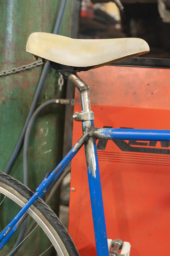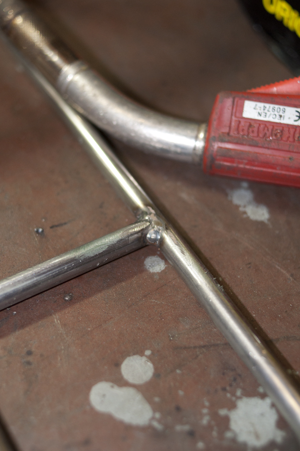 Once you are ready with bending everything, you weld it together. I like welding because once something has been welded it won’t come off from heat or strain. My welding is shit, I am no good, but the rack can still take a 50kg girl sitting on it. The fittings for the spars that attach to the lower part of the fork I welded from stainless steel. Ideally you should use a special welding electrode for welding regular steel with stainless but this is not a piece of nuclear powerplant and the welds will protected from corrosion by paint so I’m not too worried. Nuts and bolts will break any coating at the ends of the fittings and making these small pieces from stainless will keep them nice and shiny. I hope. Just remember to use stainless nuts and bolts because regular ones will rust superfast in the vicinity of the holy stainless.