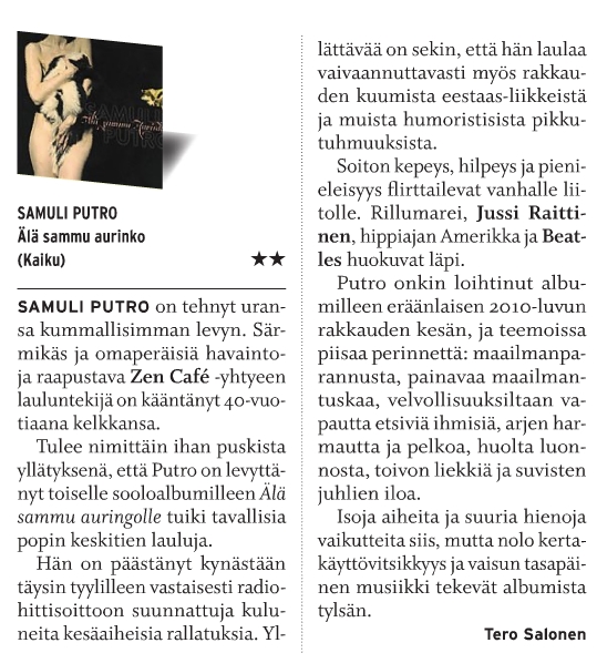 Putro taas ei tunne mitään tuskaa eikä selvästi mitään häpeääkään. Samulin kappaleet ovat vierineet tasaista alamäkeä ja aivan näihin päiviin saakka olen kuvitellut, että ainoastaan minua ja Ninaa tämä uusi musiikillinen suuntaus ei voisi vähempää sytyttää. Nyt se on kuitenkin huomattu jossain sanomalehdessäkin. Minulla on kaksijakoisia tunteita. Pitäisikö olla onnellinen kun kerrankin olen “oikeassa” vai surullinen kun olen oikeassa erään 2000-luvun alun huomattavan Raahelaislähtöisen muusikon laadullisesta romahduksesta. A.W.Yrjänänkin olisi pitänyt muuten hajottaa CMX ja tehdä soololevyjä. Jos olette lukeneet Yrjänän päiväkirjaa, voitte seurata kuinka musiikin taso laskee suoraan verrannollisesti asunnon neliöihin.