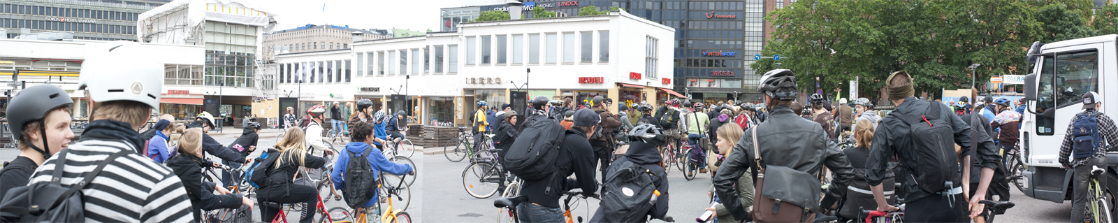 Mikäli nyt kuitenkin unohdan hyöty- ja haittaseikat, kaupungilla ajelu vähän epätavallisemmilla reiteillä oli oikein mukavaa. Iso äänentoisto ois ollut vielä mukavempaa. Reitti päättyi Sibelius-puistoon, jossa ilmeisesti keskusteltiin (fillari)politiikasta. Minä poistuin heti 50 sentin yksi auto vähemmän -tarran lunastamisen jälkeen.