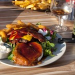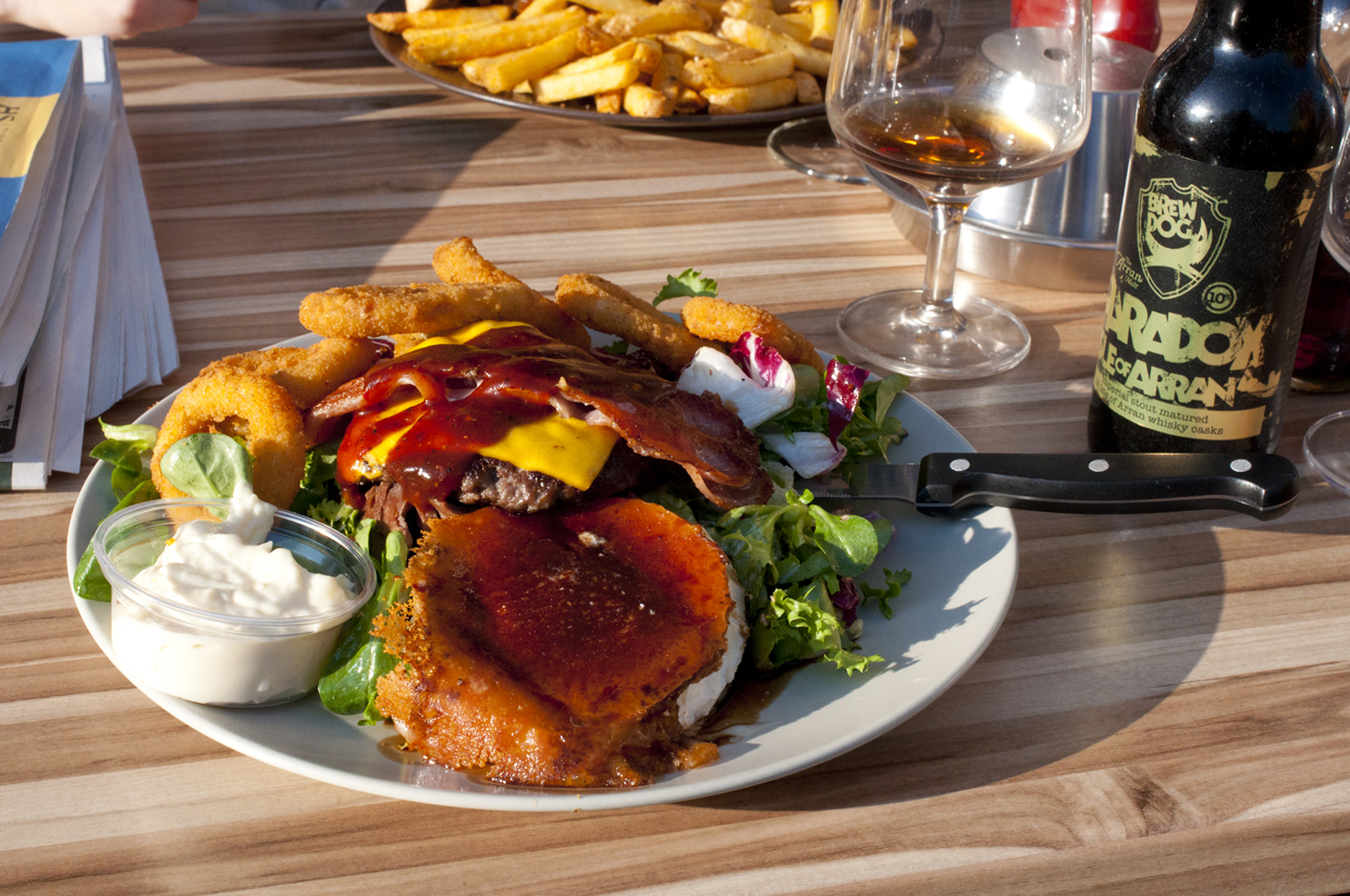 Ensimmäisen kuvan annos on Kauppuri 5:n herkullisin ruokalaji, Heinäpään Teurastaja vuohijuustolla ja sipulirenkailla!
